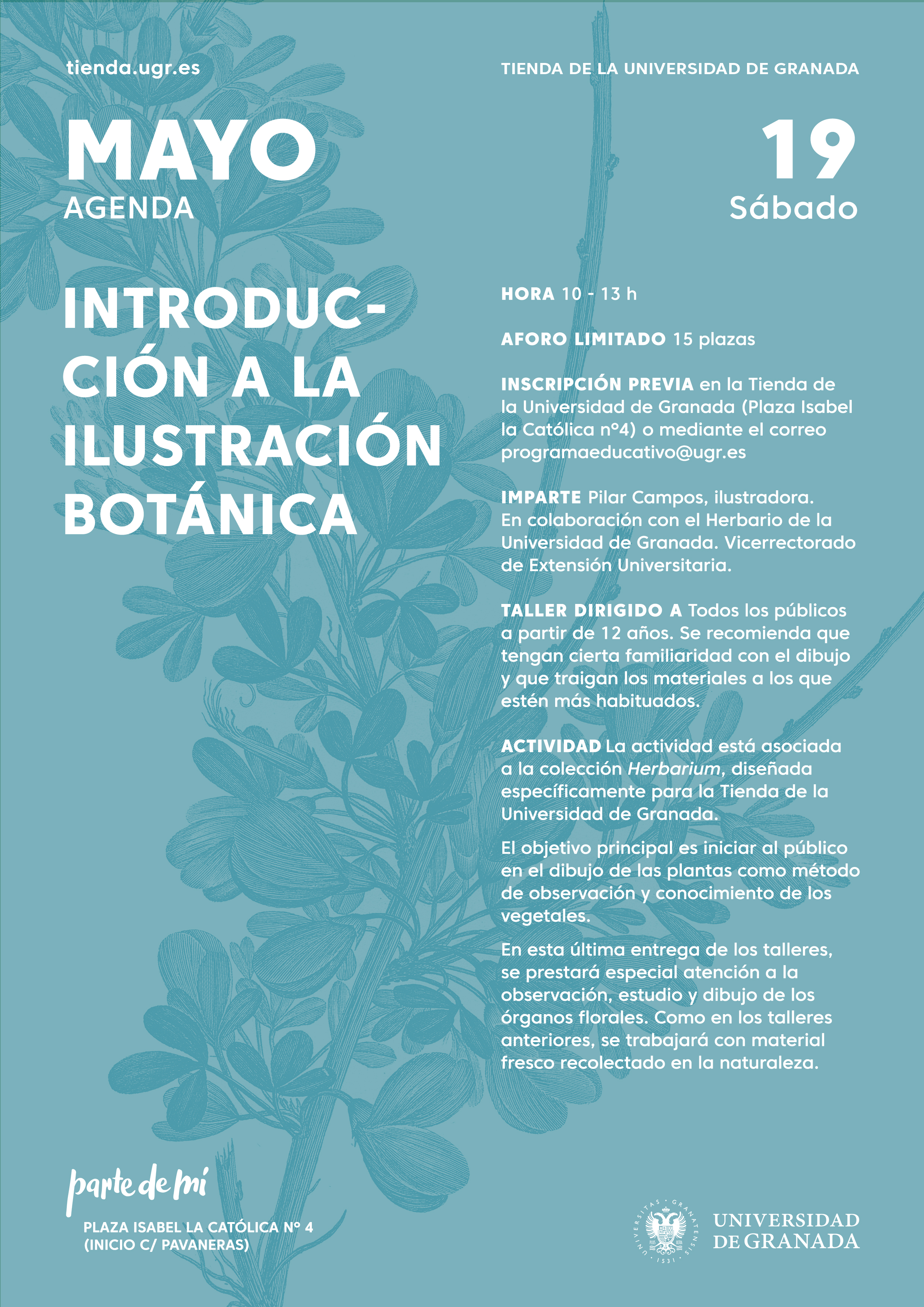 Taller INTRODUCCIÓN A LA ILUSTRACIÓN BOTÁNICA, dirigido a todos los publicos a partir de 12 años, con el que se pretende iniciar al público en el dibujo de las plantas como método de observación y conocimiento de los vegetales. Será impartido por Pilar Campos el día 19 de mayo, de 10-13 h, en la tienda de la Universidad.